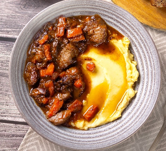 Pork fillet stripes with onion, mushrooms, aromatic sauce and mashed potatoes