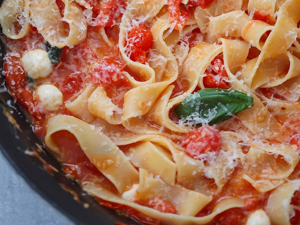 Pasta with cherry tomatoes, cheddar and mozzarella